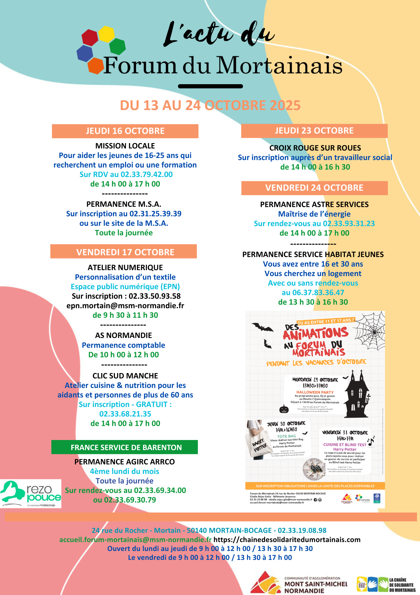 Agenda « L’actu du Forum du Mortainais » du 13 au 24 octobre 2025